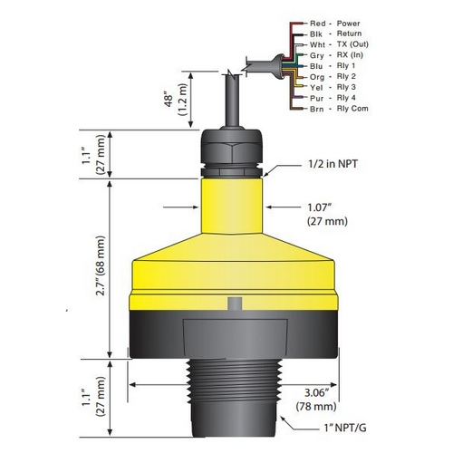 The general purpose ultrasonic level transmitter provides continuous level measurement up to 9.8' (3m) with a 4-20 mA signal output, and is configured via our free Webcal software. The level sensor has 4 programmable relays with selectable hysteresis and fail-safe logic. The embedded level controller can lower cost by replacing external control hardware. This non-contact liquid level sensor is ideally suited for corrosive, sticky or dirty liquids, and is widely selected for day tank, skid, IBC, sump and process tank level applications.