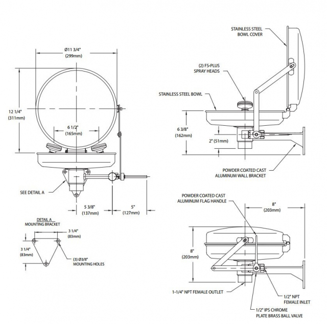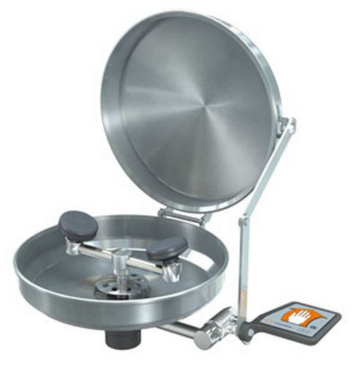 Application: Eye/face wash for wall mounting. Unit has stainless steel cover to protect bowl from dust, dirt and other contaminants. Two large FS-Plus™ spray-type outlet heads deliver a flood of water for rinsing eyes and face.