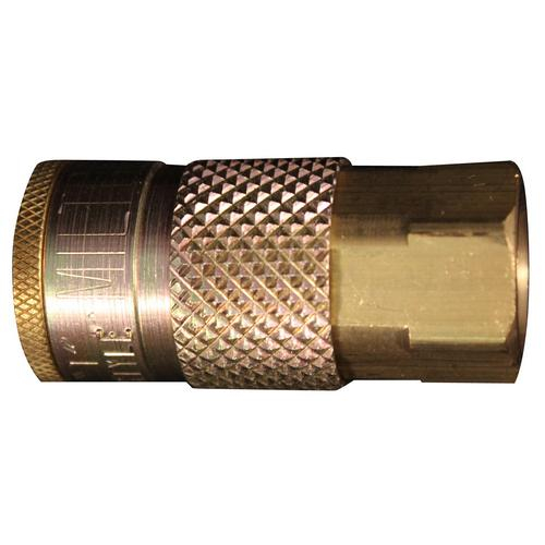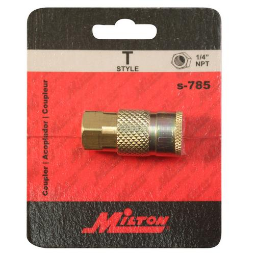 1/4" FNPT T style coupler is made of case hardened steel to resist rust. T style couplers have a basic air flow of 1/4" and a maximum of 300 PSI. Complete with a Buna-N Seal.