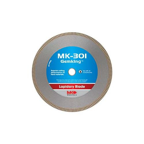 MK-301 Gemking lapidary blade has been redesigned with a greater diamond concentration and a higher carbon content steel core for improved tension memory. The solid diamond sintered kerf provides better cutting performance and improved coolant flow. The MK-301 provides superior cutting performance for hard materials such as agate, petrified wood or jade.