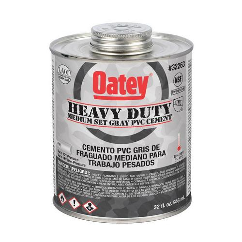 Oatey Heavy Duty Medium Set Gray PVC Cement is designed to have a thicker viscosity and medium set time for use with large diameter pipe and in commercial applications.