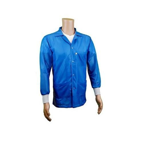 JKC 9021LB 9010 Series ESD Lab Jacket provides high quality ESD protection and made from a light-weight blend of 90% polyester and 10% conductive fibers. It features a snap front closure with a lapel-style collar and also has knitted wrist and three roomy patch pockets.