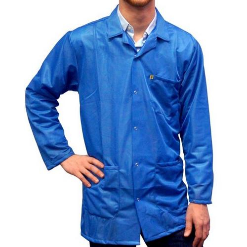 The Transforming Technologies JKC 9027SPLB provides high quality ESD protection and made from a light-weight blend of 90% polyester and 10% conductive fibers. It features a snap front closure with a lapel-style collar and also has wrist-adjustment snaps and three roomy patch pockets.