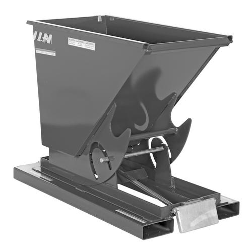 Hopper automatically dumps when bumper release contacts the front of the dumpster. Hopper returns to an upright and locked position automatically after it dumps. Also includes a cable that may be operated from the seat of the fork truck to manually dump the hopper. A safety restraint is provided to secure the hopper to the fork truck. Blue baked-in powder-coated toughness standard