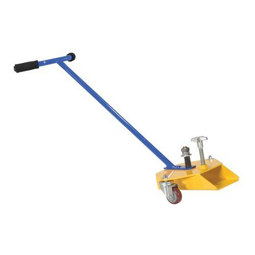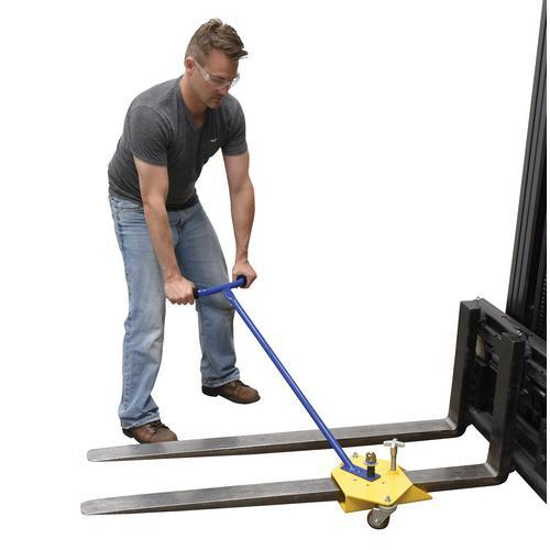 After transporting the fork to the forklift, rotate the handle 90° then slide the fork onto the mast. The Fork Caddy has easy-grip handles and rolls smoothly on two swivel casters. A star knob secures the caddy onto the fork to keep it in place while transporting. The comfort-grip handle pivots up to 180° to allow for easier mobility. The Fork Caddy is lightweight and small enough for easy storage as well.