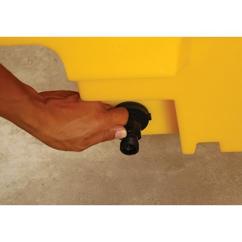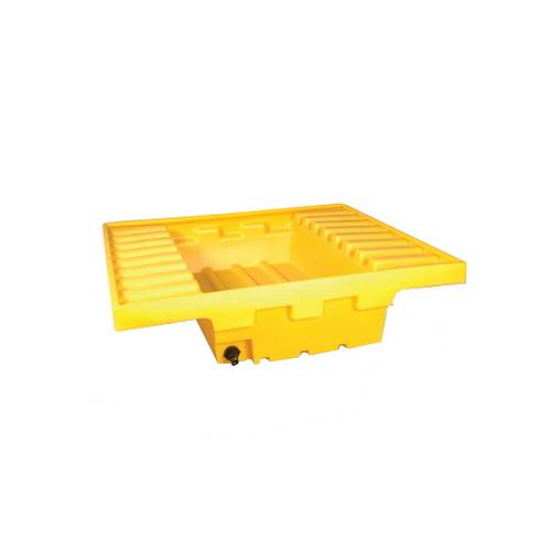 Polyethylene Pallet Rack Sump, keeps dangerous and costly spills off floors, equipment and inventory. Allows direct forklift access to wooden pallet - sump unit stays positioned in the rack when removing pallet and drums. Low profile design fits into warehouse racking with minimal obstruction to adjacent storage areas. Unit holds fifty fiber 55-gallon drums on a standard shipping pallet. Comes with drain/ball valve assembly for draining liquids.