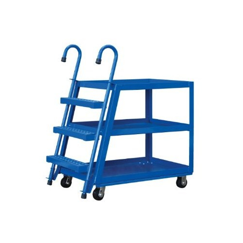 Combine the mobility of a cart with the versatility of a step ladder with our Stockpicker Trucks. Convenient spring loaded step ladder holds the cart securely in place while a person is standing on the ladder. Crutch tip ladder prevents the cart from moving while stocking. Springs then return the ladder to the raised position once personnel exit the step. All shelves have a 2" lip turned up to prevent items from falling off. Standard casters are 4" x 2" mold-on-rubber, two rigid and two swivel with wheel brakes.